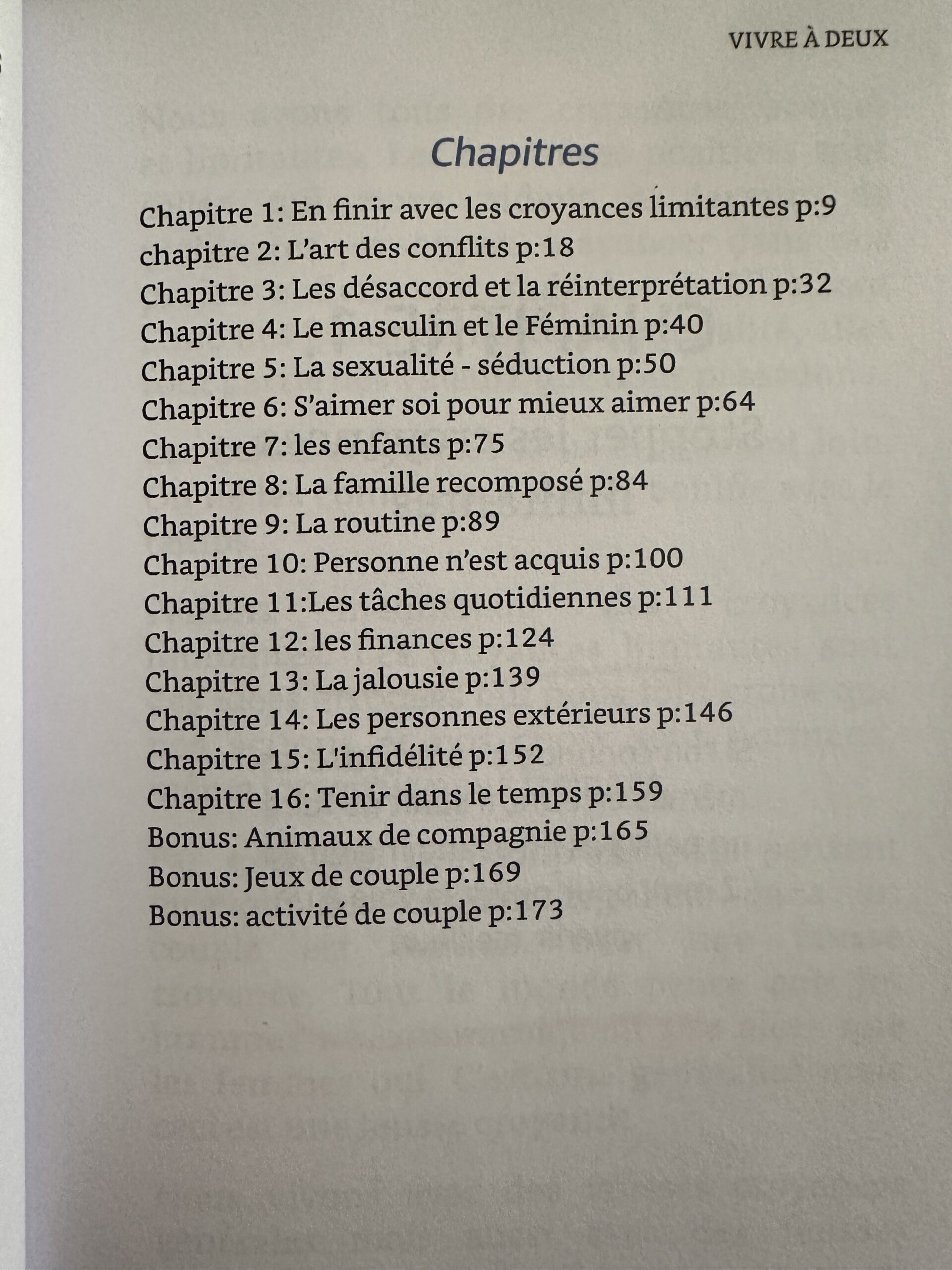 Il parle de tous les sujets du quotidien et de la vie du couple. Rancoeur, malentendu, famille, enfant, finance, répartition des tâches, sexualité, la routine et dans d’autres sujets qui vont vous émerveillé dans cette découverte de la vie fluide, facile et surtout harmonieuse qu’est la vie de couple.